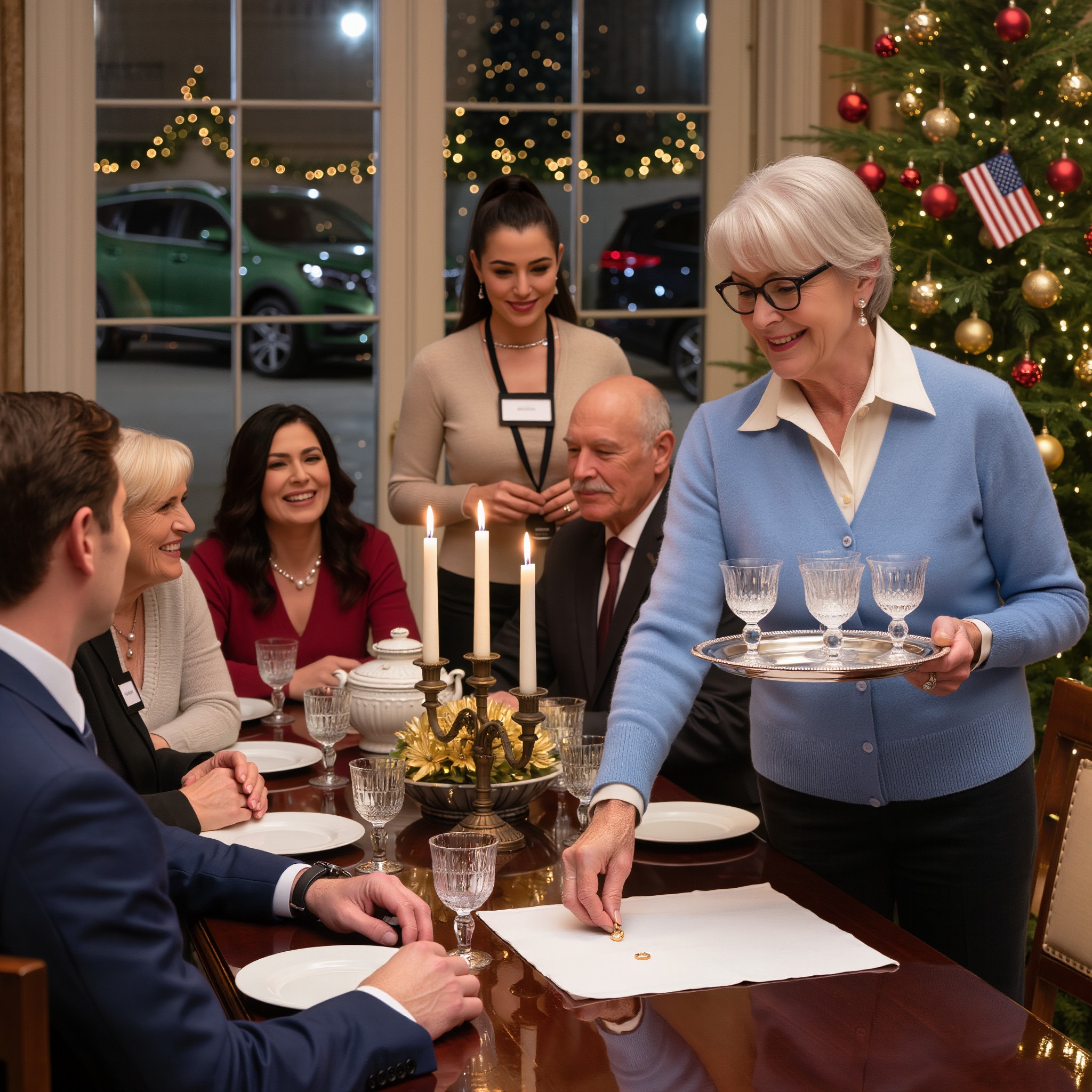 Me dieron una credencial en la cena de Navidad. Decía " Asistente de limpieza " en letras cuadradas y negritas. Mi hijo me miró mientras sostenía una bandeja con vasos y dijo, como si fuera lo más natural del mundo: "La comida es para la familia".