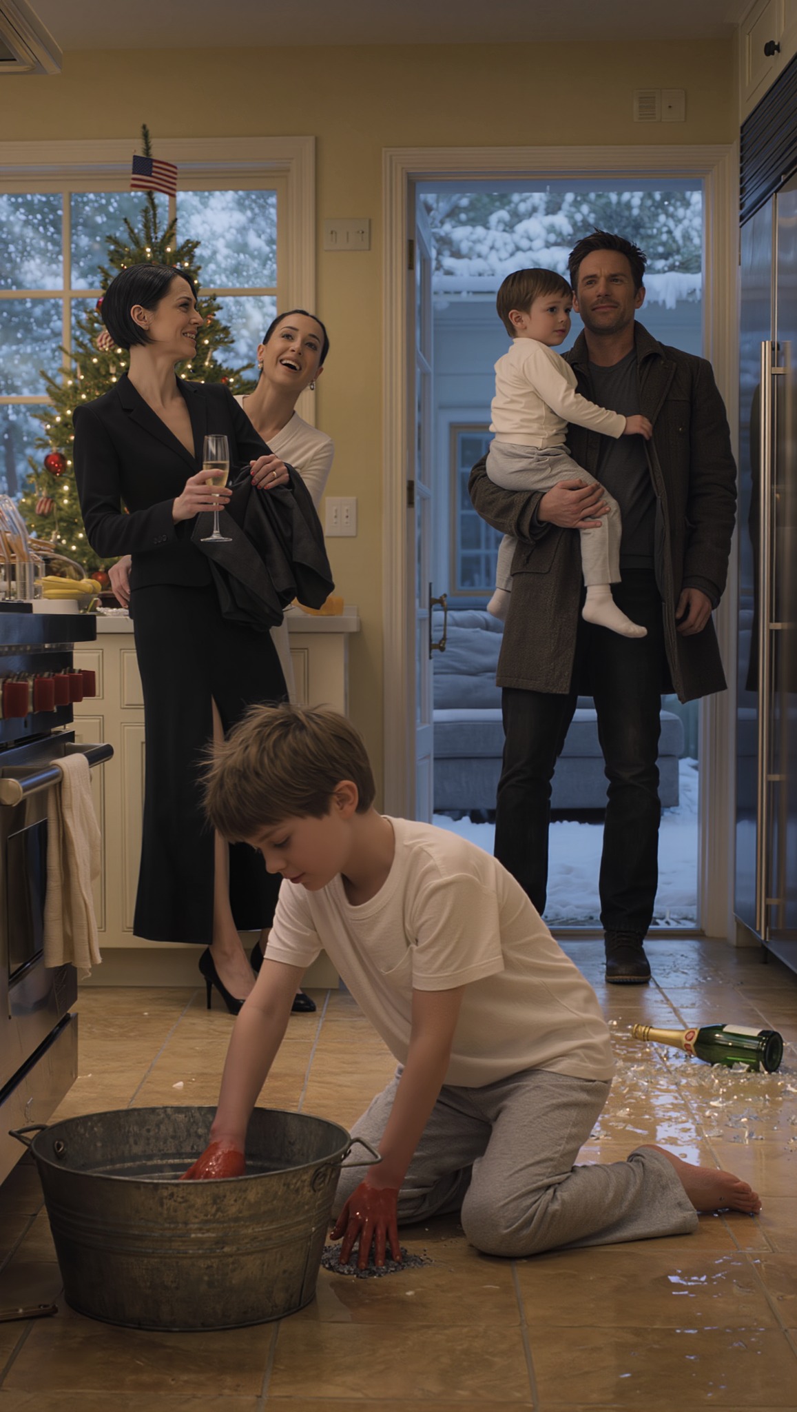 Llegué a casa de mis suegros sin avisar en Nochebuena. Encontré a mi hijo fregando pisos en ropa interior mientras sus nietos abrían los regalos junto al árbol. Mi esposa se reía con ellos. Entré, levanté a mi hijo y le dije cinco palabras. La copa de champán de mi suegra se hizo añicos.
